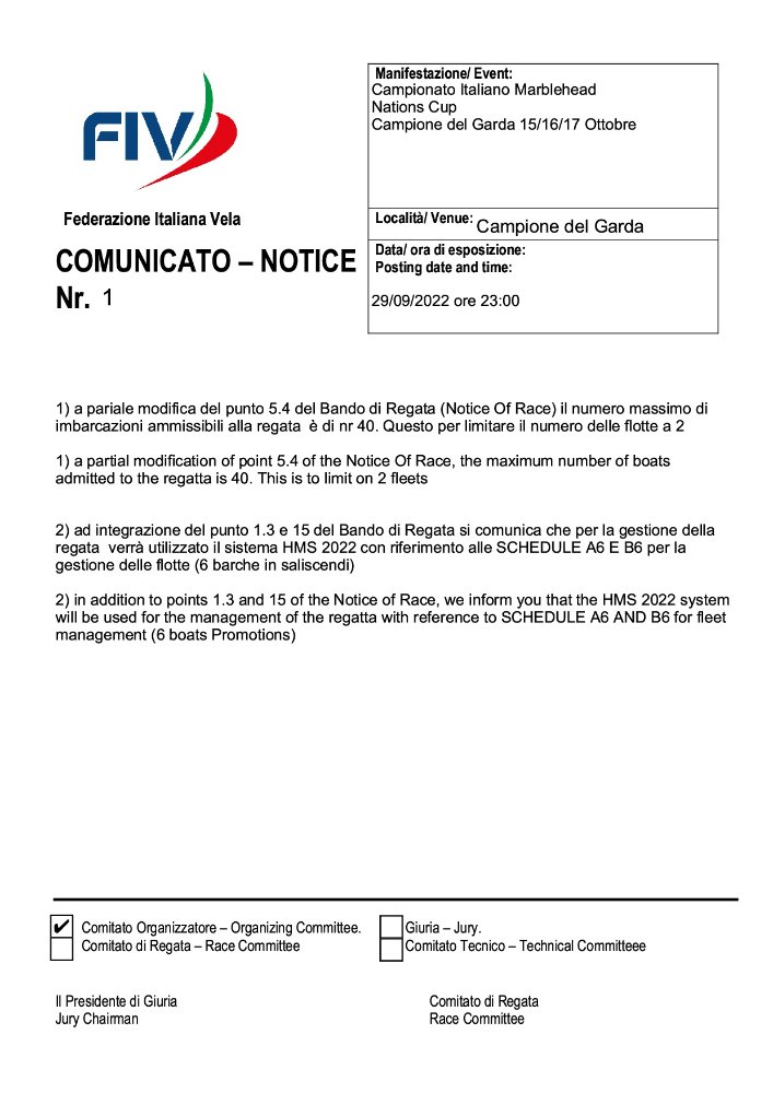 Il Segretario di classe Marblehead Roberto Tomassini comunica che durante il Campionato Italiano Marblehead avrà luogo un incontro con i concorrenti Italiani